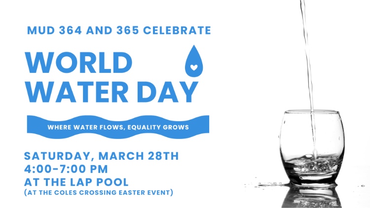 World Water Day HCMUD 3652026-03-26T16:18:05-05:00March 26th, 2026|News| MUD 364 and 365 Celebrate World Water Day Where Water Flows, Equality Grows Saturday, March 28th 4:00 PM – 7:00 PM At the Lap Pool (At the Coles Crossing Easter Event)